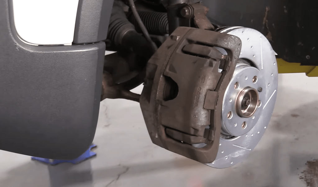 Step 4: Pop out the old brake calipers by hand and support the caliper on the spring to avoid letting the caliper hang on the brake hose and potentially damaging it.