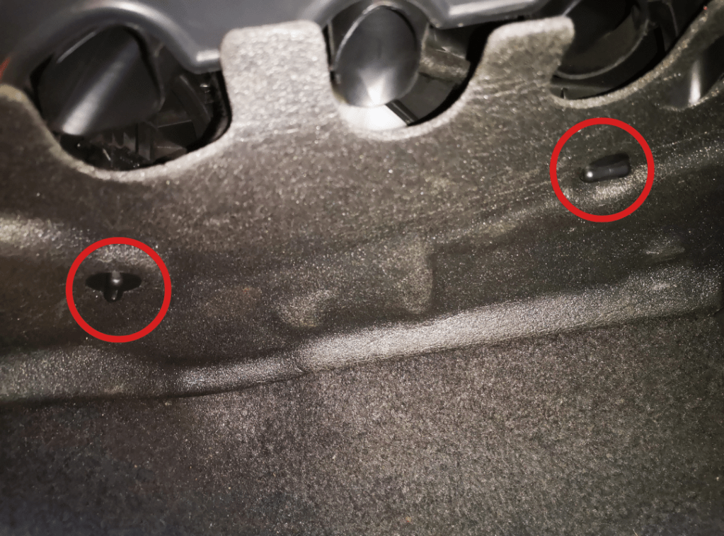 Step 1: Unscrew the 2 plastic screws (circled in red) located beneath your glovebox to remove the cover.